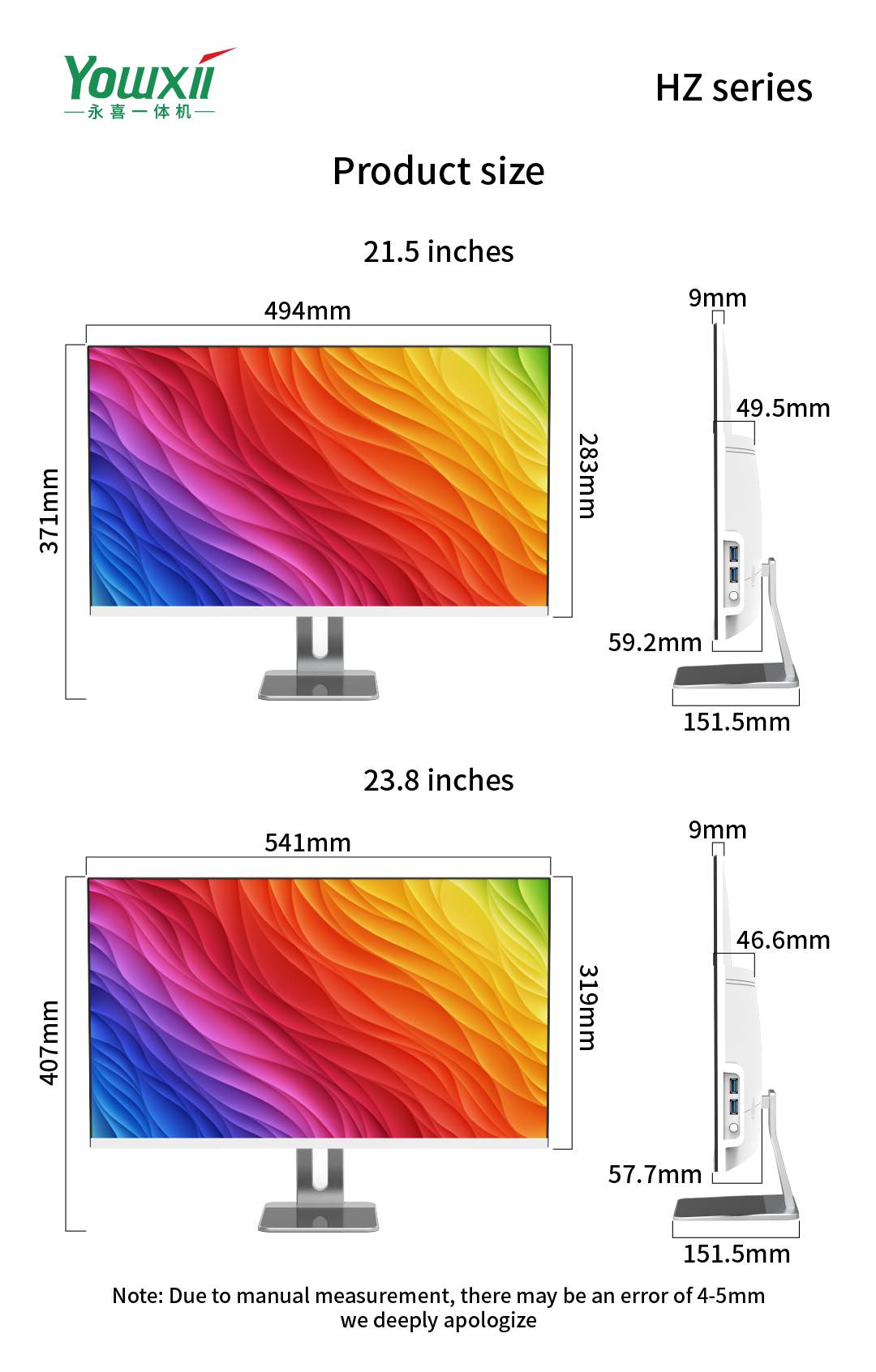 Product size(mm) 21.5':494*152*283mm23.8'':541*152*407mm